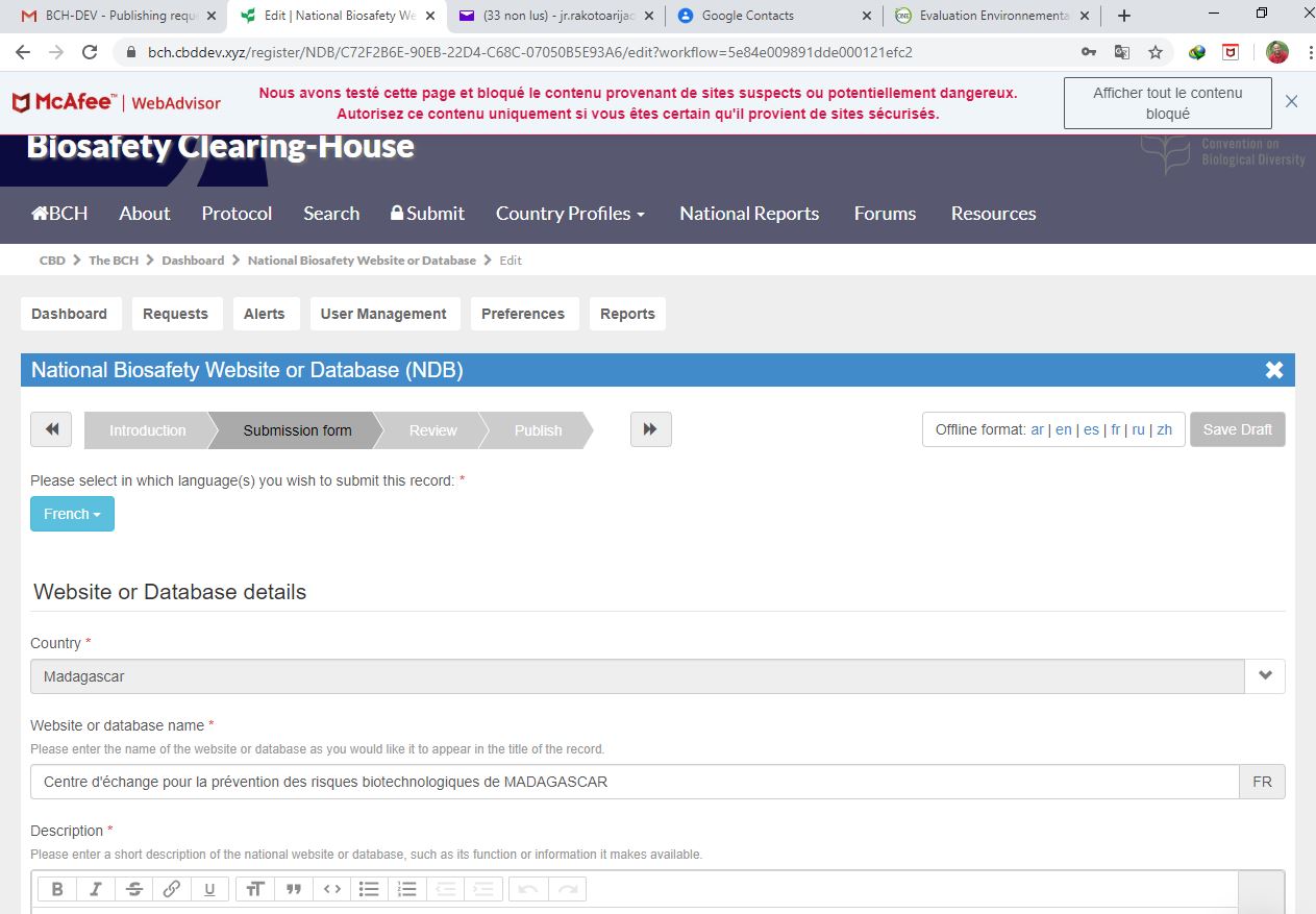 ASSIGNMENT: In National Records, create an publish a “Supplementary Protocol Competent Authority (SPCA)” and “National Biosafety Website or Database (NDB)”.