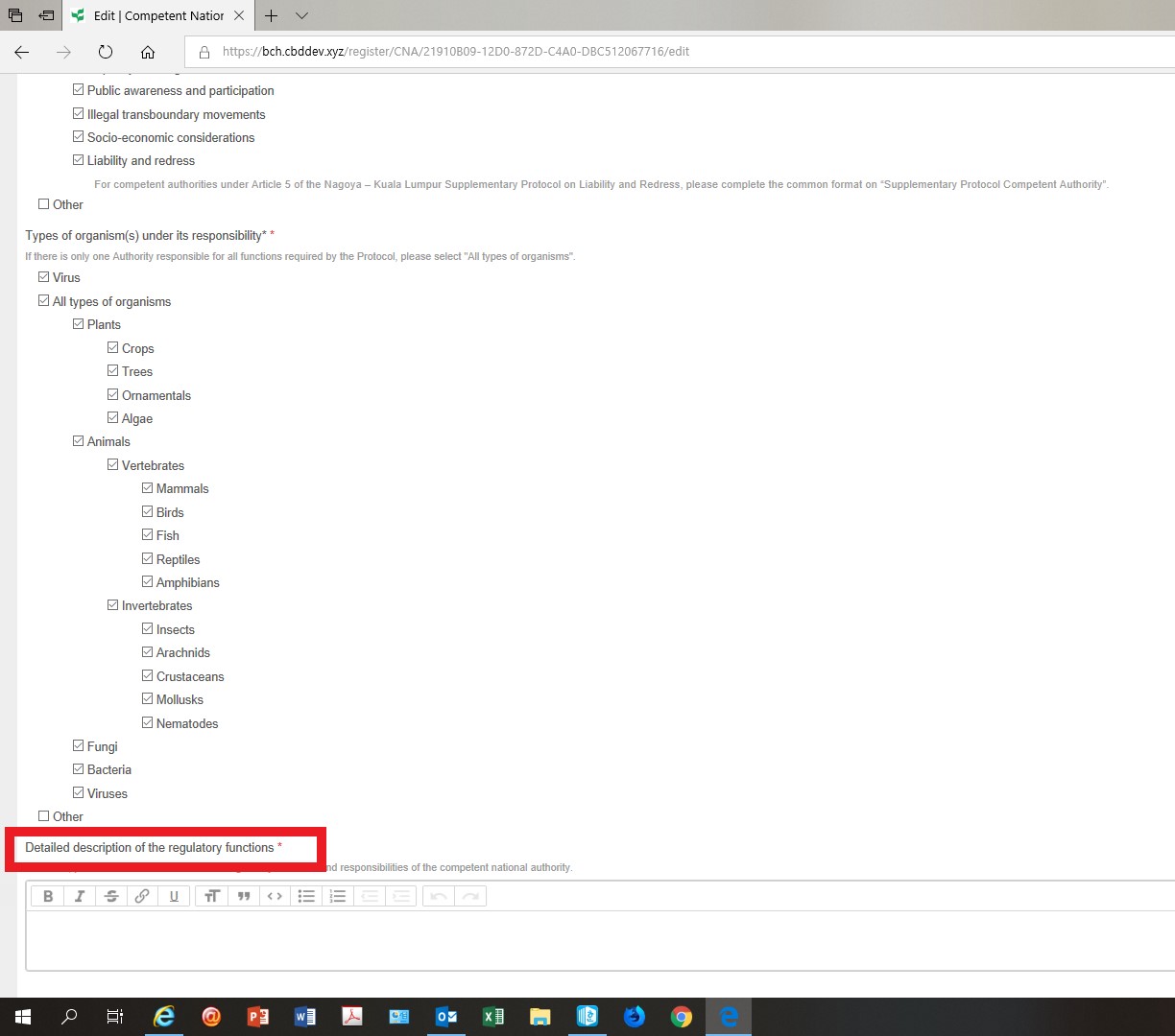 A second issue I've had is that I could not get any text to be retained as a draft or on my published record for the mandatory field "Detailed description of the regulatory functions". The system let me save a draft after I entered text in that field however none of the text was retained when I returned to the draft. I even published a second record to test this field and again no text that I had entered into this field was published. Even when I attempted to edit this second record and add text back to this field, I had the same result that my text was not retained. In all cases it said that my draft had been saved and my record was valid, despite not having any text in this mandatory field.