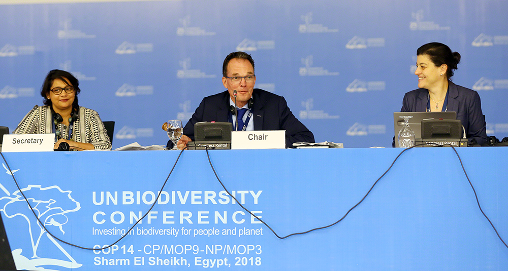 From left to right: Jyoti Mathur-Filipp, CBD Secretariat; Hayo Haanstra from the Netherlands, Chair of Working Group I; and Manoela Pessoa de Miranda, CBD Secretariat |